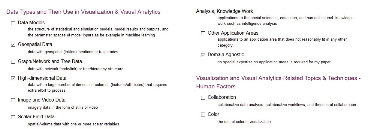 If you are the author of a paper, short or long, sent to IEEE VIS you will have to choose keywords for your submission inside the paper submission system (PCS) where the page looks like this: