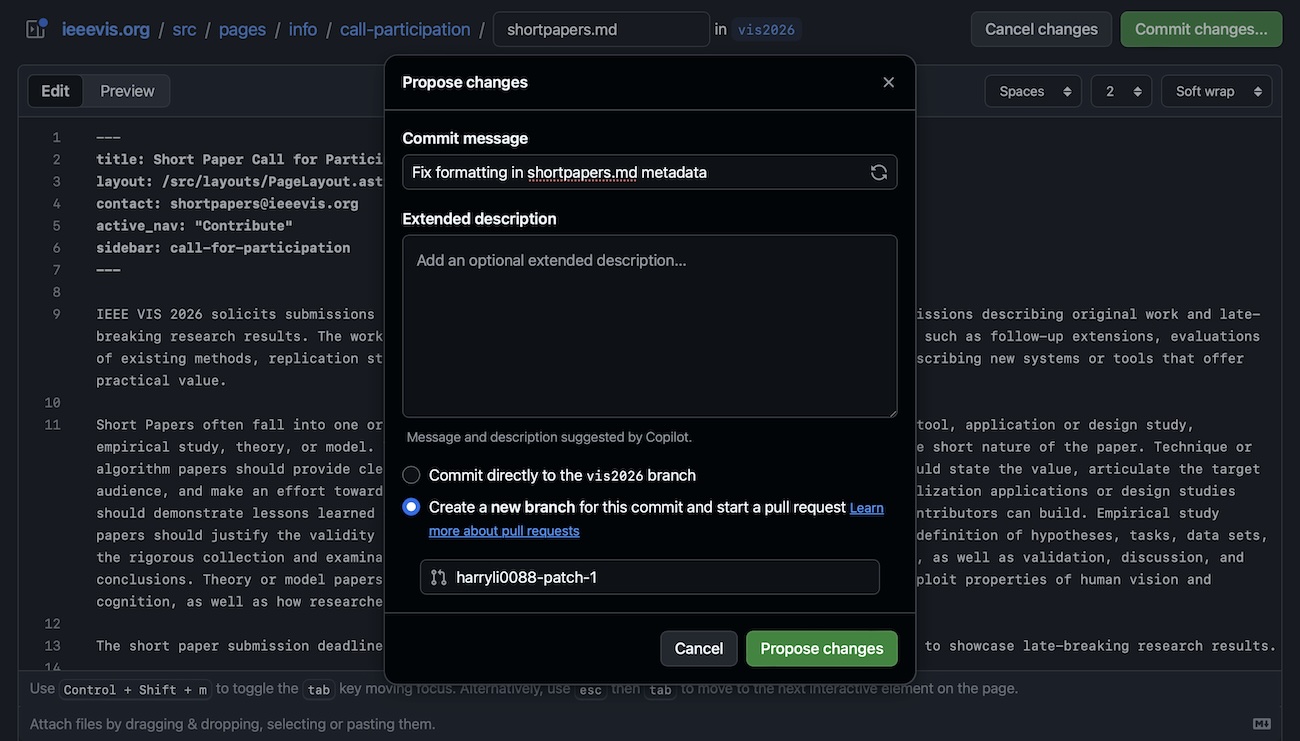If you are an organization member, the best way to suggest a change is to go on the bottom of the page you want to change and click on “suggest a fix”. You can even go to a webpage that hasn’t been created yet (like http://ieeevis.org/year/2026/hellothere) and click on the link for making a new page. You will be taken to GitHub to make your edits.